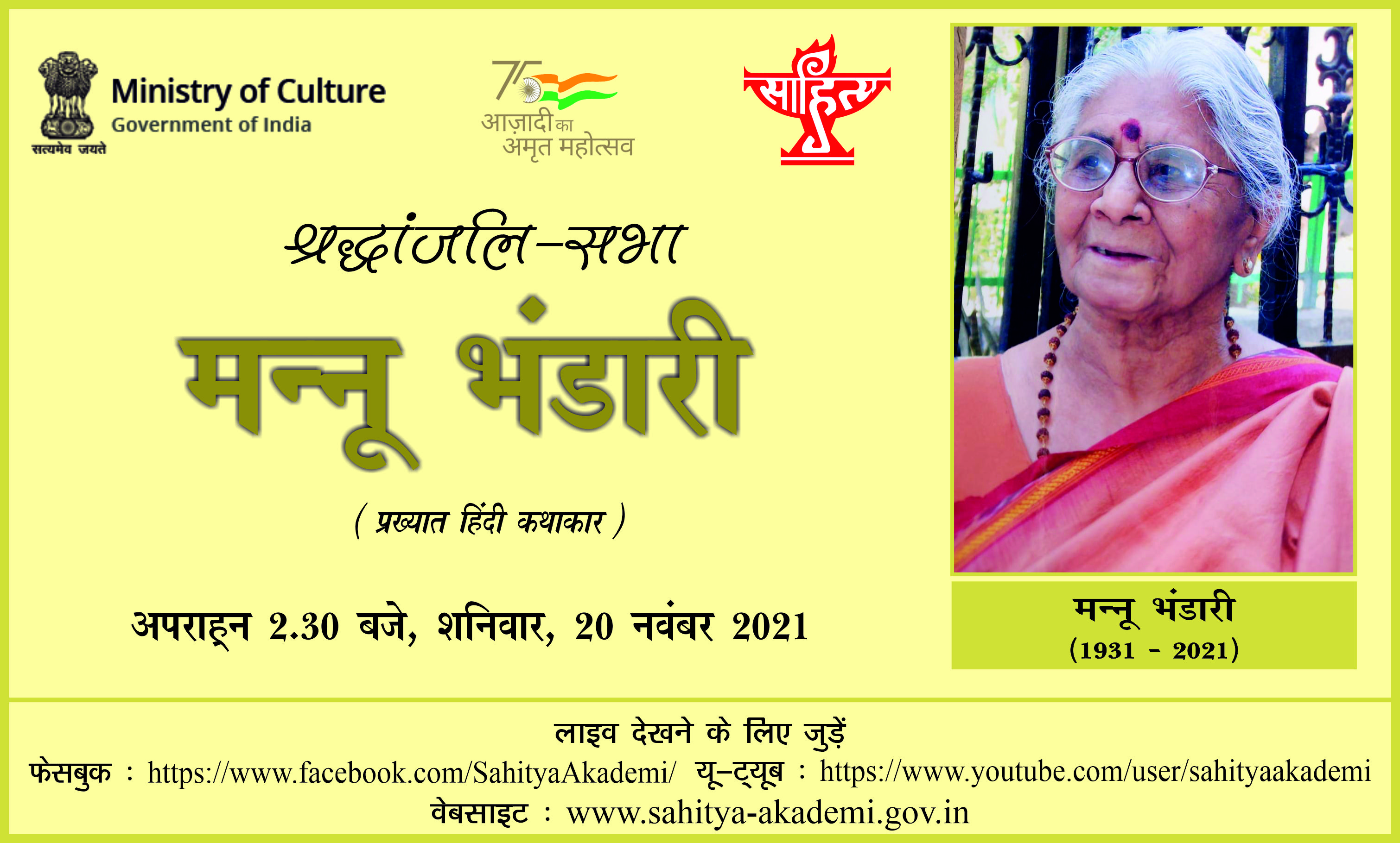 प्रख्यात हिंदी कथाकार मन्नू भंडारी - आभासी श्रद्धांजलि - सभा : 20 नवंबर 2021 अपराहन 2.30 बजे । |