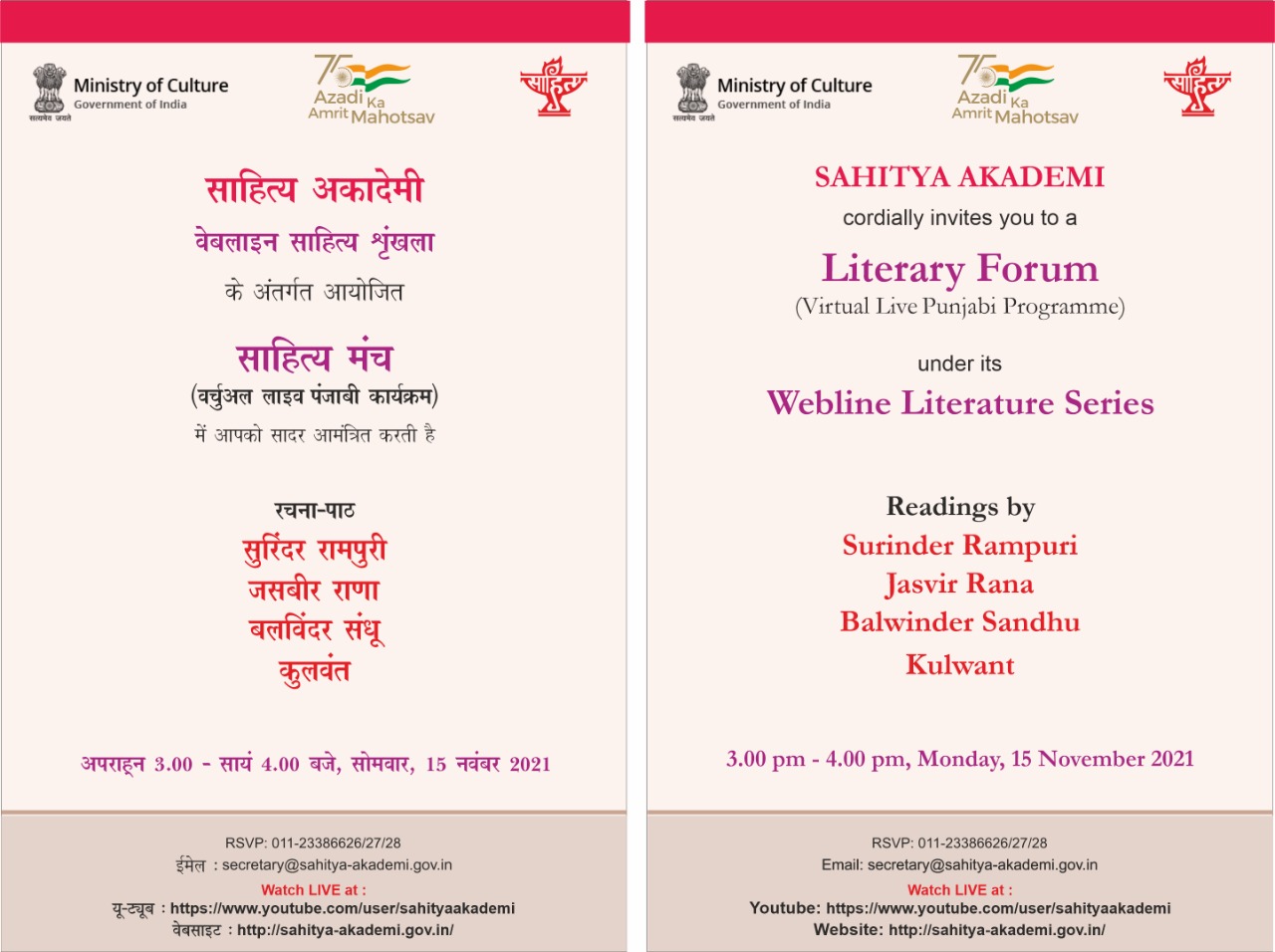 साहित्य अकादेमी वेबलाइन साहित्य शृंखला के अंतर्गत साहित्य मंच: पंजाबी कार्यक्रम सायं 3.00 बजे, 15 नवंबर 2021 |
