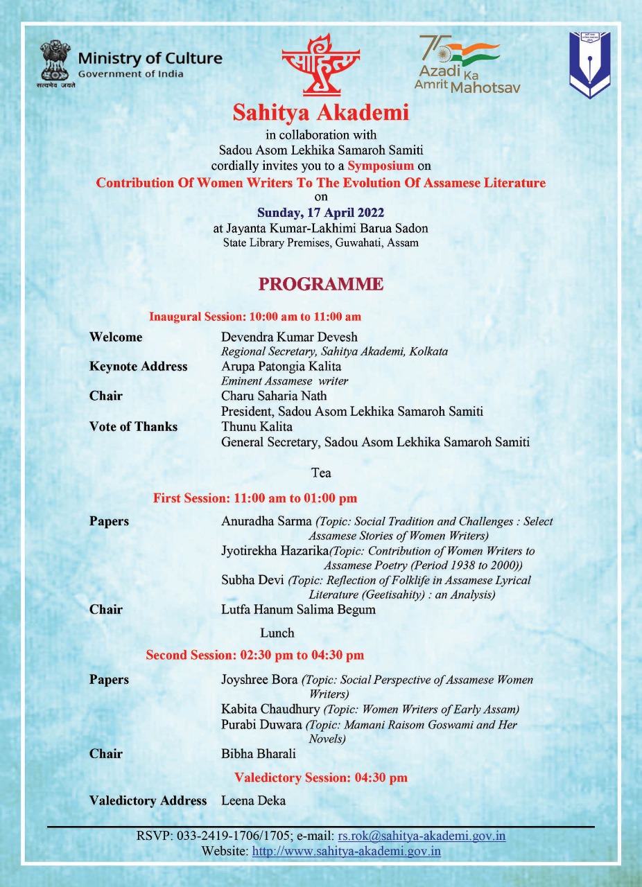 Sahitya Akademi in collaboration with Duliajan Sahitya Sabha organises Asmita: Assamese Women Writers will present their writings on 13 Feb 2022 at 5.00 pm Duliajan Bihutoli Field, Dibrugarh, Assam. |