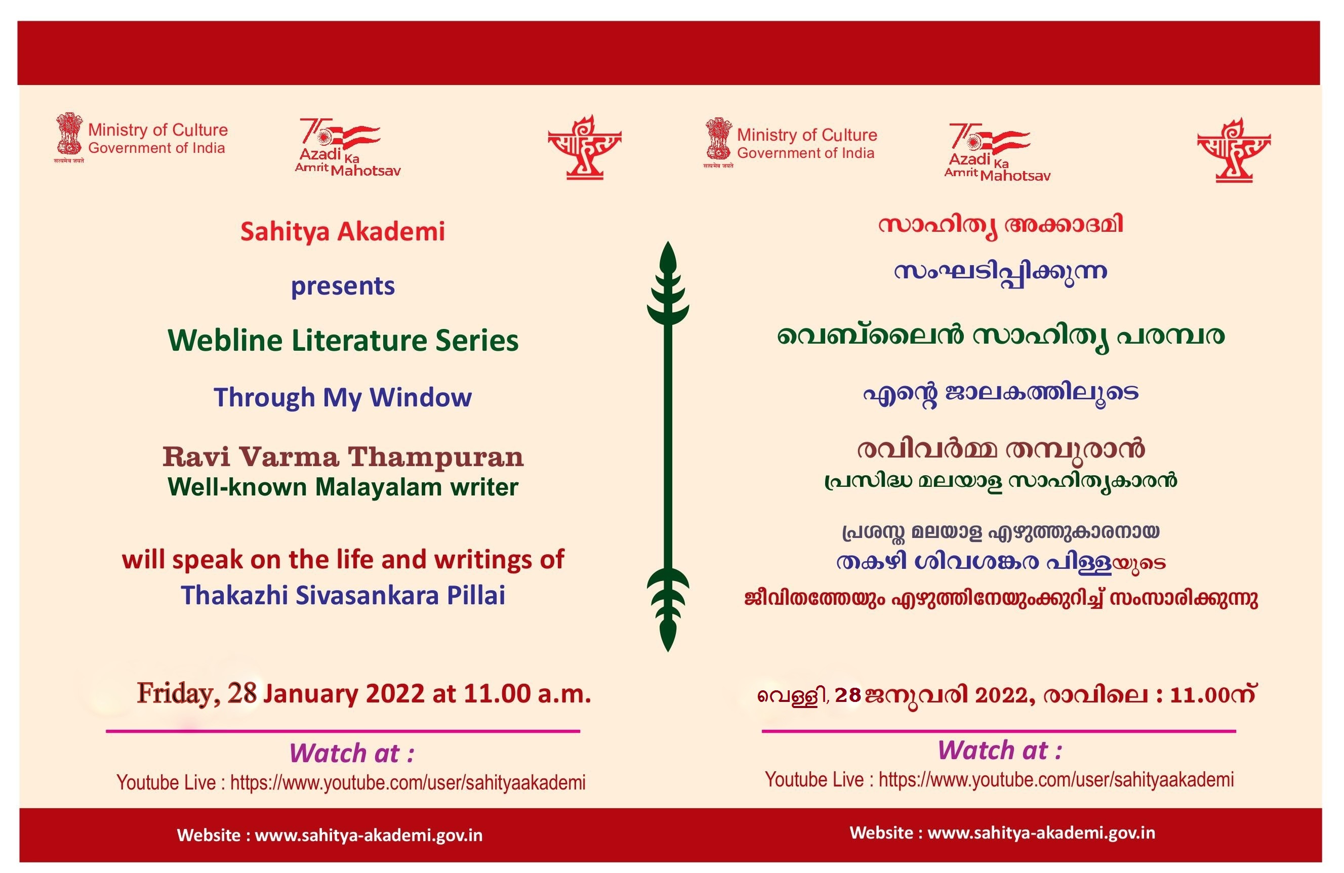 Sahitya Akademi under its Webline Literature Series organises Through My Window programme with Ravi Varma Thampuran, Well-known Malayalam writer to speak on the life and works of Thakazhi Sivashankara Pillai on 28 January 2022 at 11.00 am. (click for detail programme) |