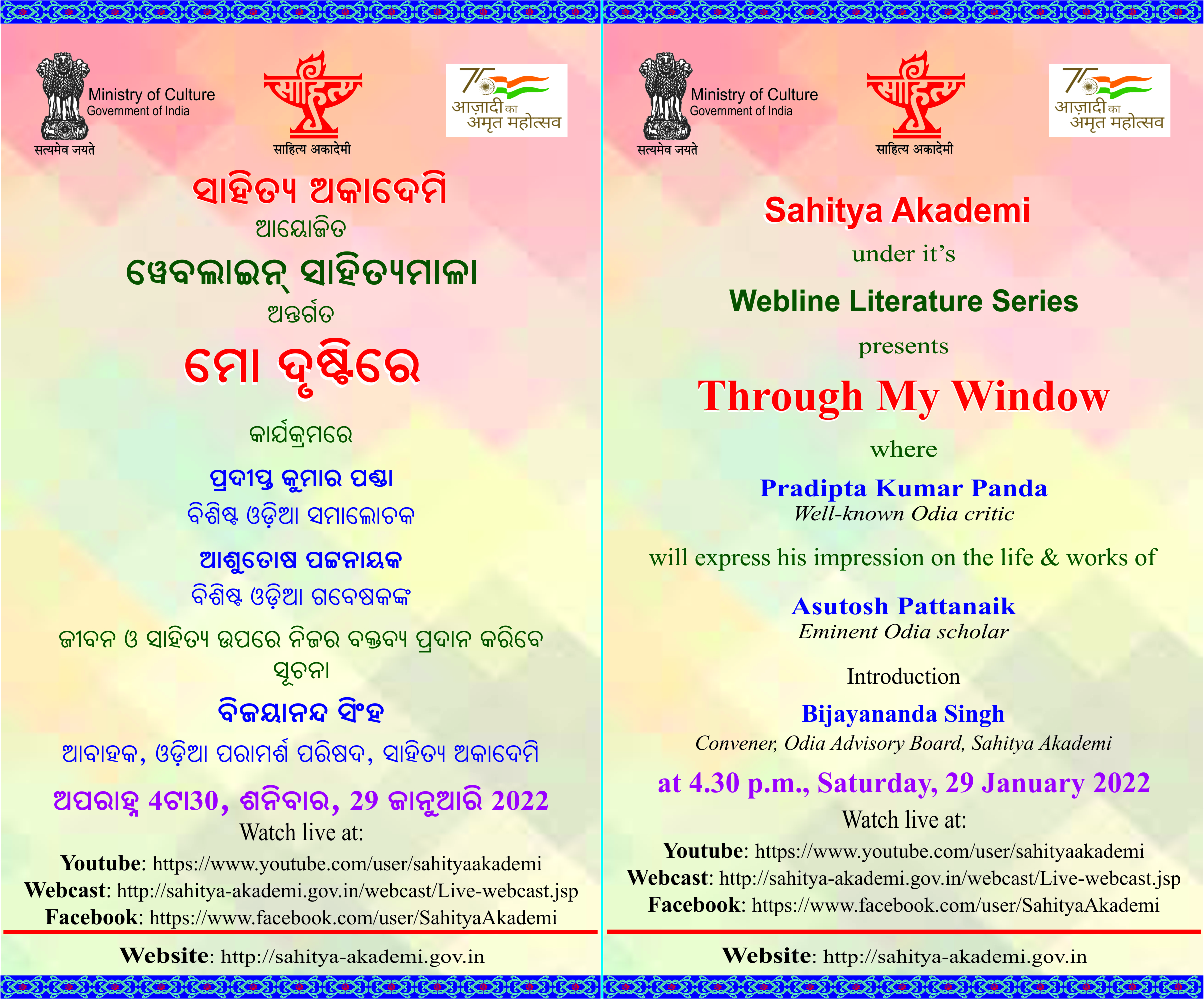 Sahitya Akademi's Webline Literature Series Programme - Through My Window with noted Odia critic Pradipta Kumar Panda Speaking of the life & work of Asutosh Pattanaik, eminent Odia scholar, Saturday, 29 January 2022, 4:30 pm. (click for detail programme) |