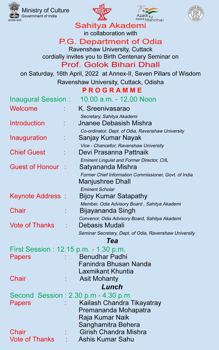 Sahitya Akademi in collaboration with Utkal Sahitya Samaj organises following programmes on 11 December 2022 at Sriramchandra Bhawan, Cuttack: