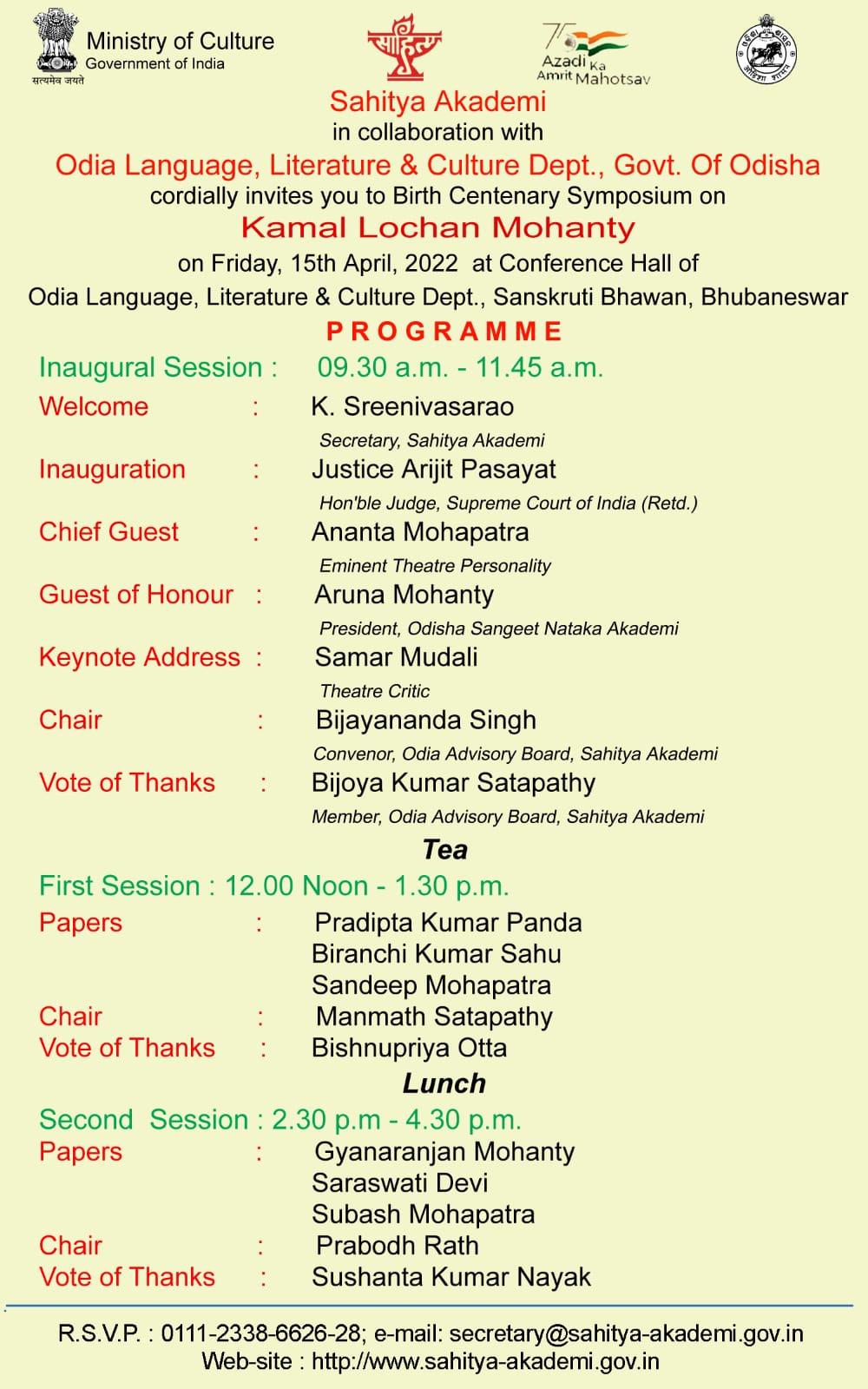 Eminent English Writer and Scholar Prafulla Mohanti will be presented Sahitya Akademi Fellowship on 15 November 2022 at 10AM - Rabindra Bhavan Lawns, New Delhi. |